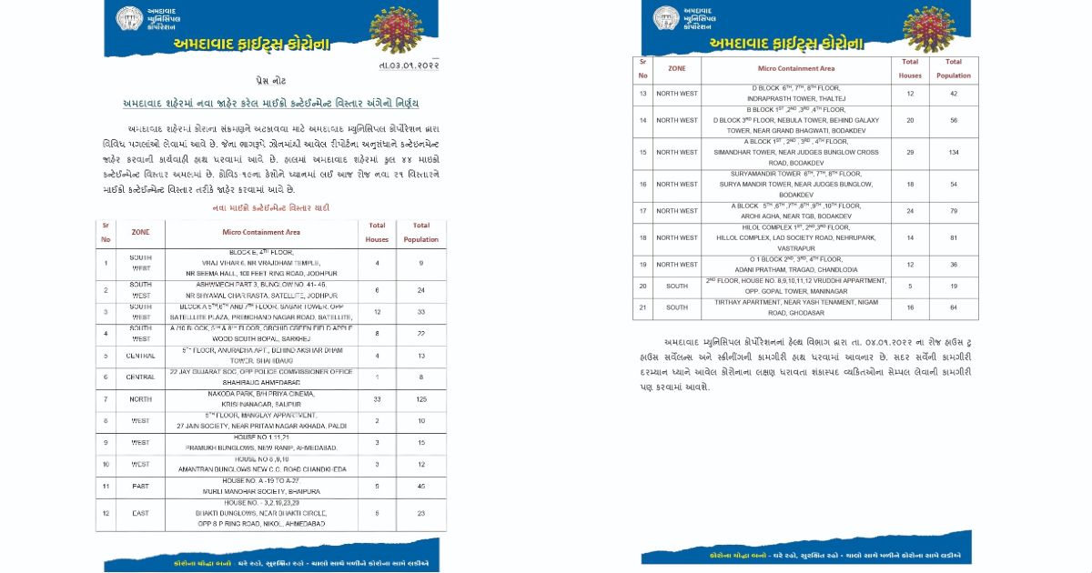 AMC દ્વારા જાહેર કરાયેલા નવા માઇક્રો કન્ટેઈન્મેન્ટ વિસ્તારમાં વ્રજ વિહાર 6 ઇ બ્લોક 4થો માળ જોધપુર, અશ્વમેઘ વિ-3 બંગલા નં. 41 થી 46 જોઘપુર, સાગર ટાવર 5 થી 7મો માળ એ બ્લોક સેટેલાઇટ, ઓર્કિડ ગ્રીન ફિલ્ડ એપલ વુડ 5 થી 8 માળ એ-10 બ્લોક સાઉથ બોપલ, અનુરાધા એપાર્ટ 5મો માળ શાહીબાગ, જય ગુજરાત સોસા. નં.22 શાહીબાગ, નકોડા પાર્ક સૈજપુર, માંગલ્ય એપાર્ટમેન્ટ 5મો માળ પાલડી, પ્રમુખ બંગલોઝ ન્યૂ ઘર નં. 1, 11 અને 21 રાણીપ, આમંત્રણ બંગલો ઘર નં. 8 થી 10 ચાંદખેડા, મુરલી મનોહર સોસા. ઘર નં. એ 19થી એ 27 ભાઇપુરા, ભક્તિ બંગલો ઘર નં. 2,3,19, 20,23,નિકોલ, ઇન્દ્રપ્રસ્થ ટાવર 6 થી 8 માળ ડી બ્લોક થલતેજ, નેબ્યુલા ટાવર બી બ્લોક, 2 થી 4 માળ ડી બ્લોક 3જો માળ બોડકદેવ, સીમંધર ટાવર એ બ્લોક, 1 થી 4 માળ બોડકદેવ, સૂર્યમંદિર ટાવર 6 થી 8 માળ બોડકદેવ, આરોહી આઘા એ બ્લોક, 5 થી 10 માળ બોડકદેવ, હિલોલ કોમ્પ્લેક્સ 1 થી 3 માળ વસ્ત્રાપુર, અદાણી પ્રથમ ઓ 1 બ્લોક, 2 થી 4 માળ ચાંદલોડિયા, વૃદ્ધિ એપાર્ટમેન્ટ 2 જોમાળ ઘર નં. 8 થી 12 મણિનગર, તીર્થય એપાર્ટમેન્ટ ઘોડાસર માઇક્રો કન્ટેઈન્મેન્ટ વિસ્તાર જાહેર કરવામાં આવ્યા છે.