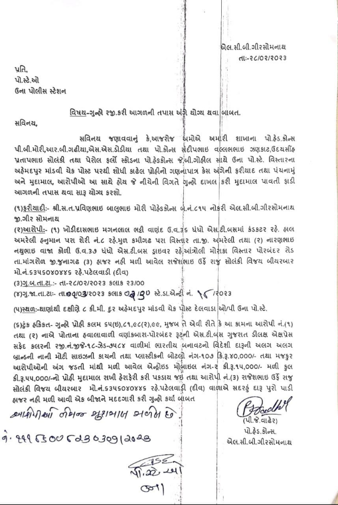 વણાકબારા પોરબંદર રૂટની ડીલક્ષ એક્ષપ્રેસ એસ.ટી.બસ નંબર જી.જે.૧૮- ઝેડ-૭૫૮૪ વાળી માંથી ભારતીય બનાવટ નો વિદેશી દારૂની અલગ અલગ બ્રાન્ડની નાની મોટી સાઈઝની કાચની તથા પ્લાસ્ટિકની બોટલો નંગ-૧૦૭ કિંમત રૂપિયા ૪૦,૦૦૦ તથા બસ ચલાવનાર ડ્રાઈવર નારણ ભાઈ નથુભાઈ વાજા તથા કંડકટર ખોડીદાસ ભાઈ મગનભાઈ ભટ્ટી બંને આરોપી અંગ જડતી માંથી મળી આવેલ એન્ડ્રોઇડ મોબાઈલ નંગ બે કિંમત ૧૫,૦૦૦ મળી કુલ ૫૫,૦૦૦ હજારનો પ્રોહિબિશન નો મુદ્દામાલ પકડી આ અંગે ઉના પોલીસ સ્ટેશન માં ગુન્હો દાખલ કરી કાયૅવાહી હાથ ધરેલ છે.
