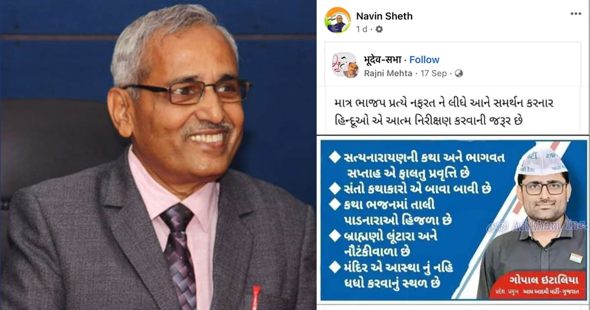 બિન રાજકીય હોદ્દો ધરાવતા GTUના કુલપતિએ સોશિયલ મીડિયા પર AAP વિરોધી પોસ્ટ શેર કરી છે. જેના કારણે શિક્ષણ જગતમાં ભારે હડકંપ મચ્યો છે. પોસ્ટમાં લખ્યું છે કે, “માત્ર ભાજપ પ્રત્યે નફરતને લીધે ગોપાલ ઇટાલિયાને સમર્થન કરનાર હિન્દુઓએ આત્મનિરીક્ષણ કરવાની જરૂર છે”