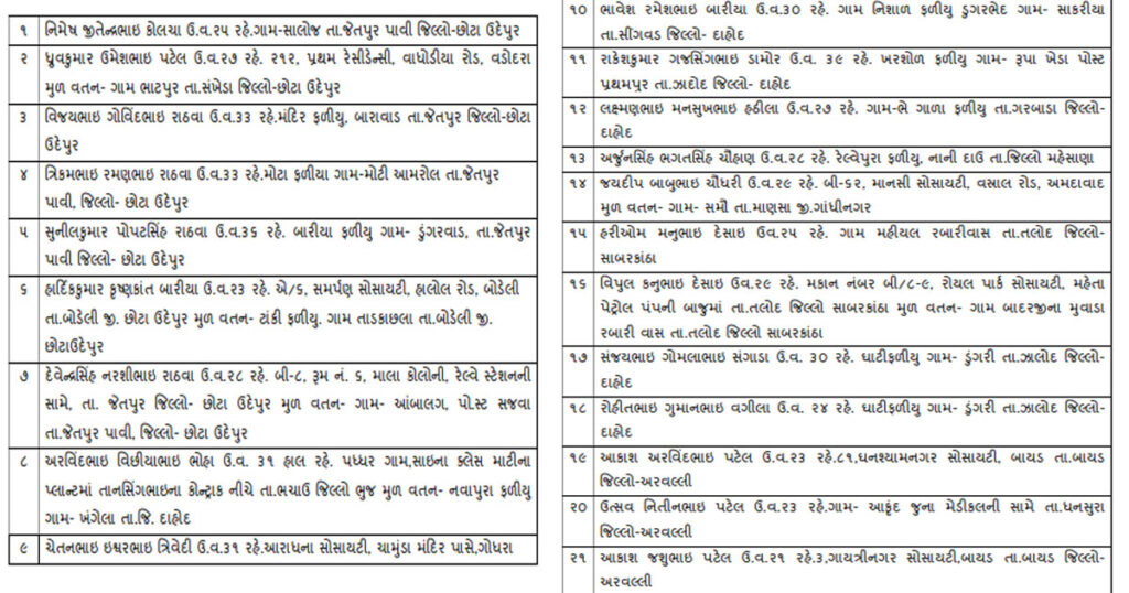 ગુજરાત ATSને ભાસ્કર ચૌધરીની ઓફિસ અને અન્ય આરોપીના વાહનોમાંથી જુનિયર ક્લાર્કની પરીક્ષાના ઉમેદવારોના કોલ લેટર, કોરા ચેક, અસલ સર્ટીફિકેટ મળી આવ્યા હતા. જેના આધારે ઉમેદવારોની ધરપકડ કરીને પુછપરછ કરતાં આરોપીઓએ જણાવ્યું હતું કે, પરીક્ષામાં પુછાનાર પેપરની વિગતો આગલી રાત્રે આપવાના હતા. જેના બદલામાં તેઓને રૂપિયા 12 થી 15 લાખ આપવાના નક્કી કર્યા હતા. ગુજરાત ATSએ તપાસમાં મળેલા દસ્તાવેજોના આધારે કુલ 30 ઉમેદવારોની ધરપકડ કરી છે. જેની વિગત નીચે મુજબ છે.