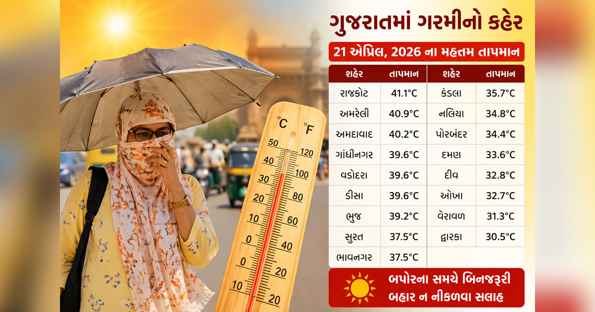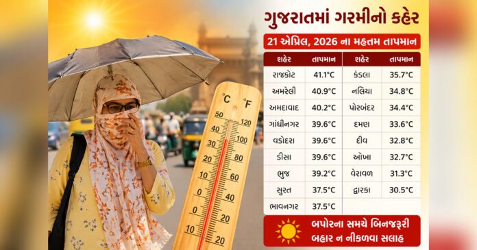 21 એપ્રિલ, 2026ના રોજ રાજ્યના મુખ્ય શહેરોના મહત્તમ તાપમાન મુજબ