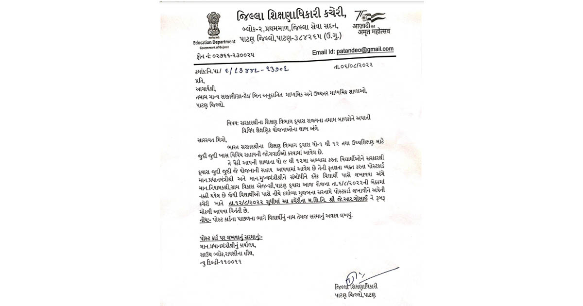 પાટણના જિલ્લા શિક્ષણાધિકારી દ્વારા પાટણ જિલ્લાની તમામ સરકારી, ગ્રાન્ટેડ અને બિન અનુદાનિત માધ્યમિક અને ઉચ્ચતર માધ્યમિક શાળાઓને એક પત્ર લખ્યો છે. જેમાં કહેવામા આવ્યું છે કે સરકાર દ્વારા ધોરણ 1થી 12માં અભ્યાસ કરતાં તેમાં ઉચ્ચ શિક્ષણ માટે પણ વિવિધ યોજનાઓ થકી લાભ આપવામાં આવે છે. હવે ધોરણ 9થી 12માં આભાસ કરતાં વિદ્યાર્થીઓએ સરકાર દ્વારા જે સહાય તેમણે મળી તેની કૃતજ્ઞતા વ્યક્ત કરતો પત્ર પ્રધાનમંત્રીએ અને મુખ્યમંત્રીને લખવાનો છે. આ નિર્ણય નિયામક ગ્રામ વિકાસ એજન્સીની મિટિંગમાં લેવામાં આવ્યો છે. આટલું જ નથી પણ દરેક શાળાના આચાર્યને સૂચના આપવામાં આવી છે કે આગામી 12 ઓગસ્ટ સુધી આ કૃતજ્ઞતા વ્યક્ત કરતો પત્ર વિદ્યાર્થીઓએ પાસે લખવીને મોકલી આપવાનો છે, જેની ઉપર PM હાઉસનું સરનામું લખવાનું છે તથા પાછળના ભાગે વિદ્યાર્થીનું નામ અને સરનામું લખવાનું છે.