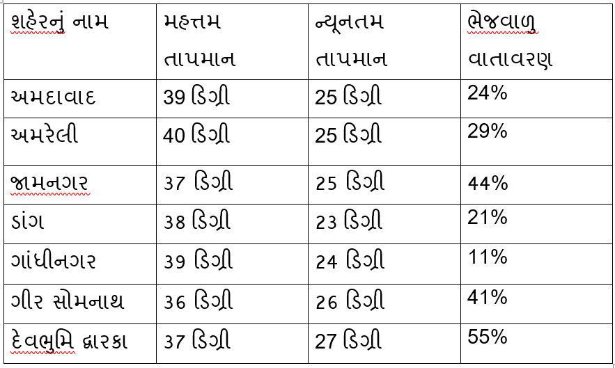2 દિવસ હવામાન વિભાગની આગાહી અનુસાર કમોસમી વરસાદને કારણે તાપમાનના પારો ગગડવાની શક્યતા છે. જે અનુસાર આજે અમદાવાદનું મહત્તમ તાપમાન 39 ડિગ્રી રહેવાની અને ન્યૂનતમ તાપમાન 25 ડિગ્રી નોંધાવાની શક્યતા છે. તેમજ અમદાવાદમાં ભેજવાળુ વાતાવરણ 24% રહેશે.