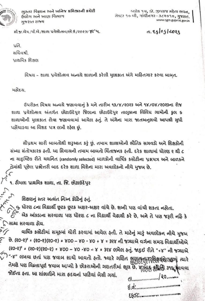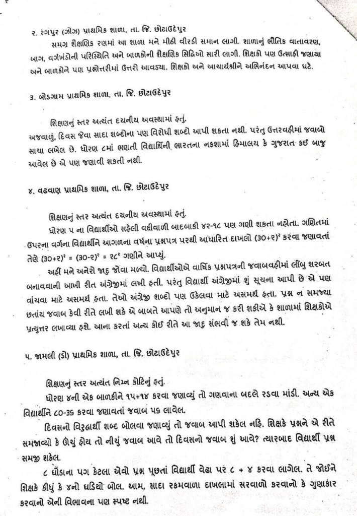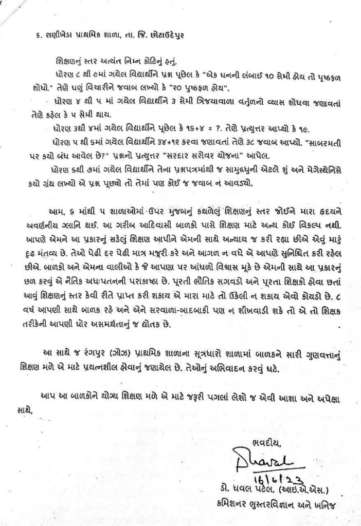 ભૂસ્તરવિજ્ઞાન અને ખનીજ વિભાગના કમિશનર ધવલ પટેલે છોટાઉદેપુર જીલ્લામાં 6 તાલુકાની શાળાઓની મુલાકાત કરી હતી, જેમાં શાળાના વિદ્યાર્થીઓને તેમણે કેટલાક સામાન્ય સવાલો પૂછ્યા હતા. વિદ્યાર્થીઓ આ સવાલોના જવાબ પણ આપી શક્યા ન હતા. ગુજરાતની શાળાઓની આ સ્થિતિ જોઈને તેમણે દુખી થયા હતા અને સરકારને પત્ર લખીને રજૂઆત કરી હતી. પત્રમાં તેમણે જણાવ્યું છે કે, શાળામાં ભૌતિક સગવડો અને શિક્ષકોની સંખ્યા સિવાય તમામ બાબતો ચિતાજનક છે. વિદ્યાર્થીઓ સામાન્ય ગણિતના સવાલોના જવાબ પણ આપી શકતા નથી.