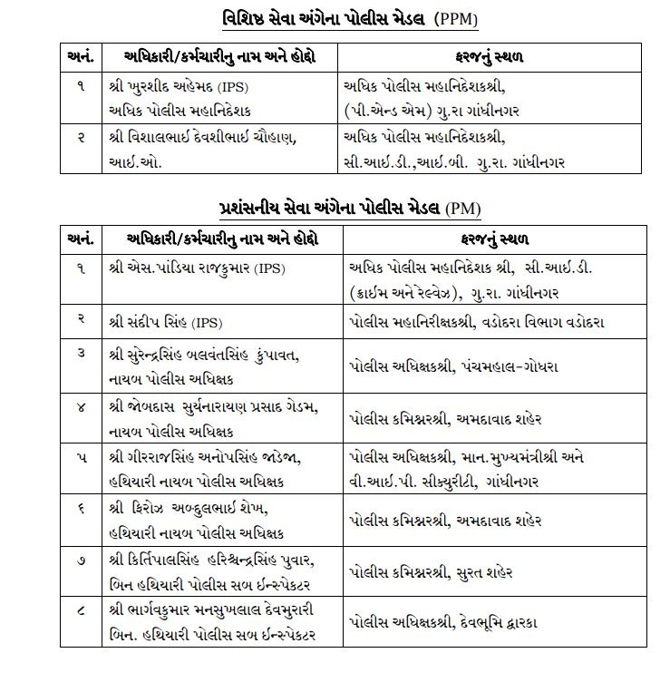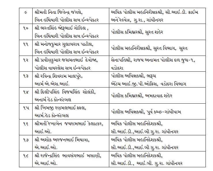 ગુજરાતમાંથી પ્રશંસનીય કામગીરી બદલ 2 IPS અને 4 DySP અધિકારીઓની પસંદગી કરવામાં આવી છે. જેમાં ડો. રાજકુમાર પાંડિયા IPS, ADGP, CID ક્રાઈમ અને રેલવે, ગાંધીનગર, સંદિપ સિંહ IPS, IGP, વડોદરા રેન્જ, સુરેન્દ્રસિંહ બલવંતસિંહ કુંપાવત DySP, ગોધરા પંચમહાલ, જોબદાસ સુર્યનારાયણ પ્રસાદ ગેડમ DySP, અમદાવાદ શહેર, ગિરિરાજસિંહ અનોપસિંહ જાડેજા, હથિયારી DySP, સીએમ સિક્યુરિટી, ફિરોજ અબ્દુલભાઈ શેખ, હથિયારી DySP,અમદાવાદ શહેર, કિર્તિપાલસિંહ હરિચંદ્રસિંહ પુવાર, PSI, સુરત શહેર, નિતા જિતેન્દ્રભાઈ જંગલે, PSI, CID ક્રાઈમ અને રેલવે, ગાંધીનગર, ભરતસિંહ જોરુભા ગોહિલ, PSI, સુરત શહેર, મનોજ ગુલાબરાવ પાટીલ, PSI, સુરત રેન્જ, ભાર્ગવ મનસુખલાલ દેવમુરારી, હથિયારી PSI,દેવભૂમિ દ્વારકા, પ્રવિણ જસમતભાઈ દેત્રોજા, વાયરલેસ PSI, SRP જૂથ-1, વડોદરા, રવિન્દ્ર શિવરામ માલપુરે, હથિયારી એએસઆઈ, ભરુચ, હાલ વડોદરા રેન્જ કચેરી, દિલીપસિંહ વિજયસિંહ સોલંકી, હેડ કોન્સ્ટેબલ, અમદાવાદ શહેર, ખિમજી રણમલભાઈ ફફલ,હેડ કોન્સ્ટેબલ, ગાંધીધામ, પૂર્વ કચ્છ, રેખાબેન જયરામભાઈ કેલાટકર, I.O., CID આઈબી, ગાંધીનગર, અશોક અરજનભાઈ મિયાત્રા, A.I.O., CID આઈબી, ગાંધીનગર, રાજેન્દ્રસિંહ ભાવનસંગભાઈ મસાણી, A.I.O., CID આઈબી, ગાંધીનગરની પસંદગી કરવામાં આવી છે.