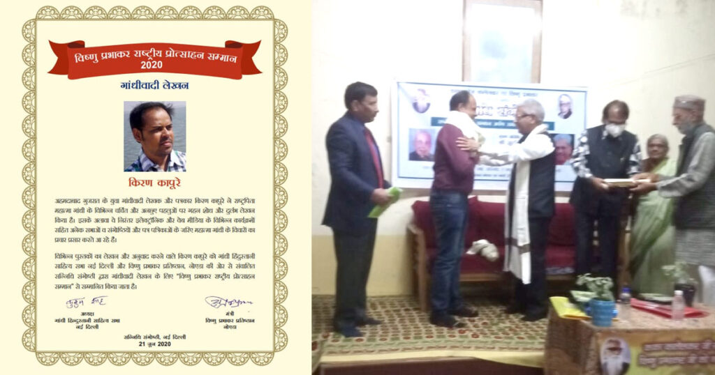 ગાંધીવિચારના સંશોધક, સંપાદક અને કટારલેખક કિરણ કાપુરેને આજે દિલ્હીમાં ‘વિષ્ણુ પ્રભાકર રાષ્ટ્રીય પ્રોત્સાહન સન્માન’થી નવાજવામાં આવ્યા. તેમને આ સન્માન ‘ગાંધીવાદી લેખન’ માટે આપવામાં આવ્યું છે. કિરણ ગયાં ચારેક વર્ષથી ગાંધીવિચારને વરેલાં માસિક ‘नवजीवनનો અક્ષરદેહ’ના દૃષ્ટિપૂર્ણ અને પરિશ્રમી સંપાદક છે.