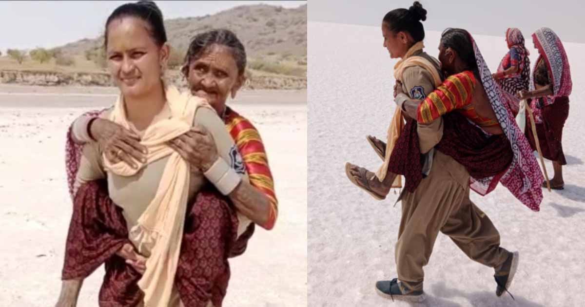 મહિલા પોલીસકર્મી અડધા ડુંગરે પહોંચ્યા ત્યારે એક માજી બેભાન અવસ્થામાં દેખાયા હતા. જેથી મહિલા પોલીસકર્મીએ માજીને મોઢા પર પાણી છાંટીને ભાનમાં લાવી પાણી પીવડાવ્યુ. માજી ચાલી શકે તેવી પરિસ્થીતી ન હોવાથી તેઓ કથા સ્થળ પર માજીને 5 કિ.મી સુધી પોતાના ખભા પર ઉંચકીને લઈ આવ્યા હતા. જે રણમાં ચાલતી વખતે પોતાના શરીરનો પણ વજન લાગતો હોય તેવા રણમાં મહિલા પોલીસકર્મી માજીને ખભા પર બેસાડીને લઈને આવ્યા.