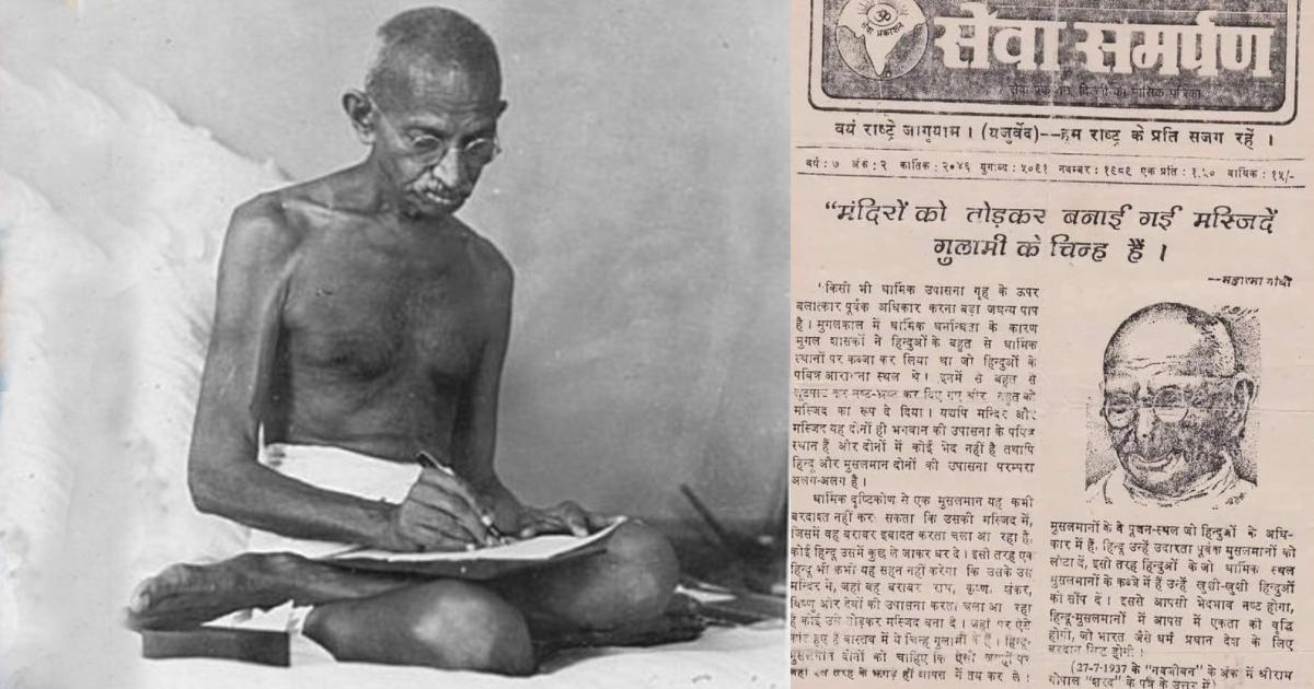કિરણ કાપૂરે (નવજીવન ન્યૂઝ.અમદાવાદ): નેશનલ મીડિયામાં અત્યારે ગાંધીજીના નામે એક સ્ટોરી ચાલી રહી છે અને તેમાં ગાંધીજીનું એક વાક્ય ટાંકવામાં આવ્યું છે. ગાંધીજીનું પોતાનું લખાણ હોય તે રીતે આર્ટીકલના મથાળામાં મૂકાયેલું આ વાક્ય છે : ‘मंदिरो को तोडकर बनाई गई मस्जिदें गुलामी के चिन्ह है’. આ લેખ જ્યાં છપાયો છે તે હિંદી મેગેઝિનનું નામ ‘સેવા સમર્પણ’ છે અને તેની છપાયાની તારીખ નવેમ્બર 1989ની છે.