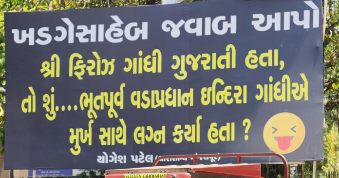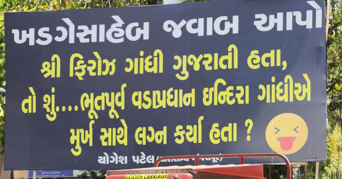 ‘ખડગે સાહેબ જવાબ આપો શ્રી ફિરોઝ ગાંધી ગુજરાતી હતા તો શું ભૂતપૂર્વ વડાપ્રધાન ઇન્દિરા ગાંધીએ મૂર્ખ સાથે લગ્ન કર્યા હતા?’ આવા લખાણવાળા બેનરના પગલે આચાર સંહિતાની ફરિયાદ (Code of Conduct Violation Complaint) થઈ છે. વિશ્વામિત્રી બચાવો સમિતિના એડવોકેટ શૈલેષ અમીને ફરિયાદ આપી છે. જેમાં જણાવ્યું છે કે, છેલ્લાં 10 દિવસથી જગજાહેર આચારસંહિતા ભંગ કરી, રોડ રસ્તા તોડી રોડ વચ્ચે ગેરકાયદેસર હોર્ડિંગ લગાવવામાં આવ્યું છે. આમ છતાં ધારાસભ્યના ગેરકાયદેસર કૃત્ય સામે આંખ આડા કાન કરવામાં આવી રહ્યા છે.