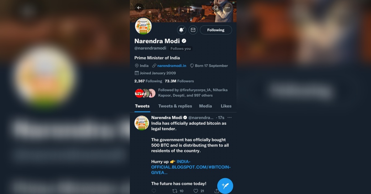 ટ્વિટર પર ઘણા વપરાશકર્તાઓએ ટ્વીટના સ્ક્રીનશોટ શેર કર્યા છે. પીએમ મોદીના એકાઉન્ટ પરથી એક ટ્વીટમાં લખ્યું છે, “ભારતે સત્તાવાર રીતે બિટકોઇનને કાનૂની સ્વીકૃતિ આપી છે. સરકારે સત્તાવાર રીતે 500 બિટકોઇન (બીટીસી) ખરીદ્યા છે અને દેશના નાગરિકોમાં તેનું વિતરણ કરી રહી છે.” આ ટ્વીટ સાથે કૌભાંડની લિંક પણ જોડવામાં આવી હતી.