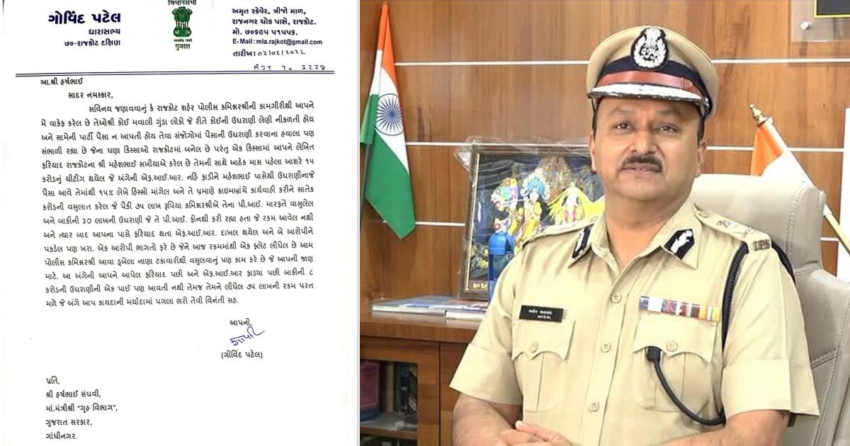 નવજીવન ન્યૂઝ.રાજકોટ: રાજકોટ શહેરના પોલીસ કમિશનર મનોજ અગ્રવાલ પર નાણા વસુલીના ગંભીર આક્ષેપ લાગ્યા છે. આ આક્ષેપ સત્તાધારી પક્ષના ધારાસભ્ય અને રાજ્યના પૂર્વ મંત્રી ગોવિંદ પટેલ દ્વારા લગાવાયા છે. ગોવિંદ પટેલે 15 ટકા હિસ્સો માંગી કમિશનરે ઉઘરાણી કરી આપવાના અને એફ.આઈ.આર. દાખલ નહીં કરવાના આરોપ લગાવ્યા છે. ગોવિંદ પટેલે આ આરોપ લગાવતો પત્ર ગૃહરાજ્ય મંત્રી હર્ષ સંઘવીને લખી જાણ કરી છે. ધારાસભ્યના આ પત્રને પગલે પોલીસ બેડામાં ખળભળાટ મચી જવા પામ્યો છે.