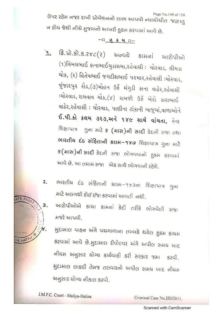 ઉલ્લેખનીય છે કે, વર્ષ 2010માં મીત વૈદ્ય અને હરીશ ચુડાસમા નામના ફરિયાદી પર હુમલો કરવામાં આવ્યો હતો. જે મામલાનો કેસ માળિયા હાટીના કેસમાં ચાલી રહ્યો હતો અને તેમાં ધારાસભ્ય વિમલ ચૂડાસમા સહિત 3 આરોપીઓ સામેલ હતા. આ મામલાની સુનવણી કરતા માળીયા હાટીના કોર્ટ દ્વારા તમામ આરોપીઓને 6 માસની કેદની સજા ફટકરવાનો હુકમ કર્યો છે.