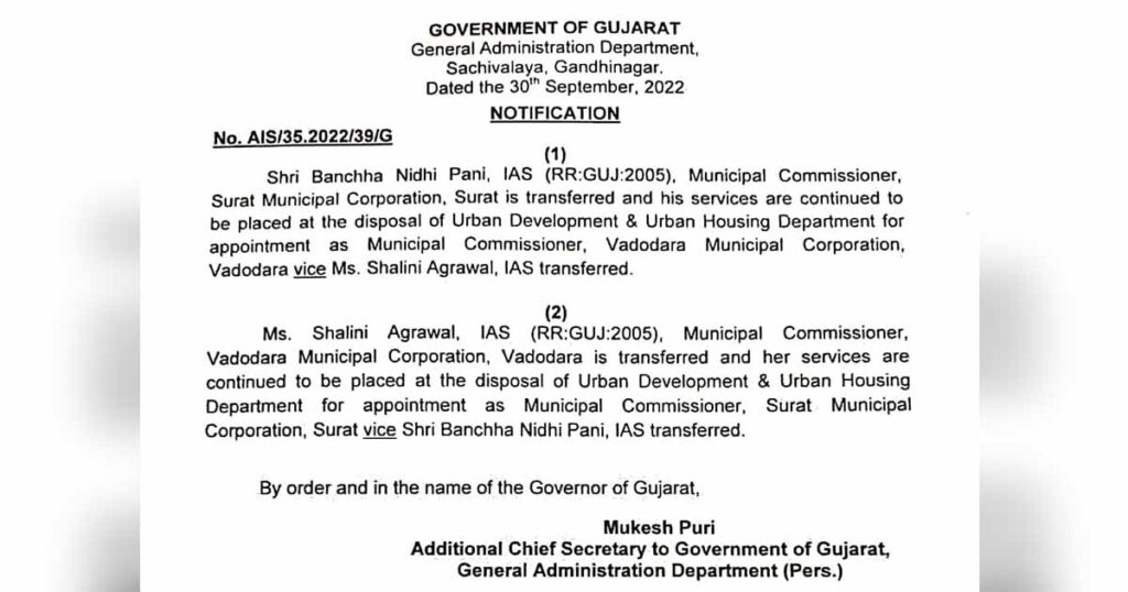 ચૂંટણી પંચના નિયમ અનુસાર, ત્રણ વર્ષ કે તેથી વધુ સમય સુધી એક જ જગ્યાએ ફરજ બજાવતા અધિકારીઓની બદલીઓ કરવી. જેના ભાગરૂપે સુરત અને વડોદરાના મ્યુનિસિપલ કમિશનરની આંતરિક બદલી કરવામાં આવી છે. બંછાનિધી પાનીની વડોદરા મનપાના નવા કમિશનર બન્યા છે. જ્યારે શાલિની અગ્રવાલ સુરતના નવા મ્યુનિસિપલ કમિશનર બન્યા છે. અત્રે ઉલ્લેખનીય છે કે, PM મોદી ગુજરાતની મુલાકાતે બે દિવસ આવ્યા હતા. તેઓ પરત દિલ્હી ફરતા ફરતા રાજ્યમાં IAS અધિકારીઓની બદલીનો દોર શરૂ થયો છે. ત્યારે આગામી સમયમાં પોલીસ અને વહીવટી ખાતામાં વધુ બદલી આવી શકે તેવી ચર્ચાઓ પણ ચાલી રહી છે.