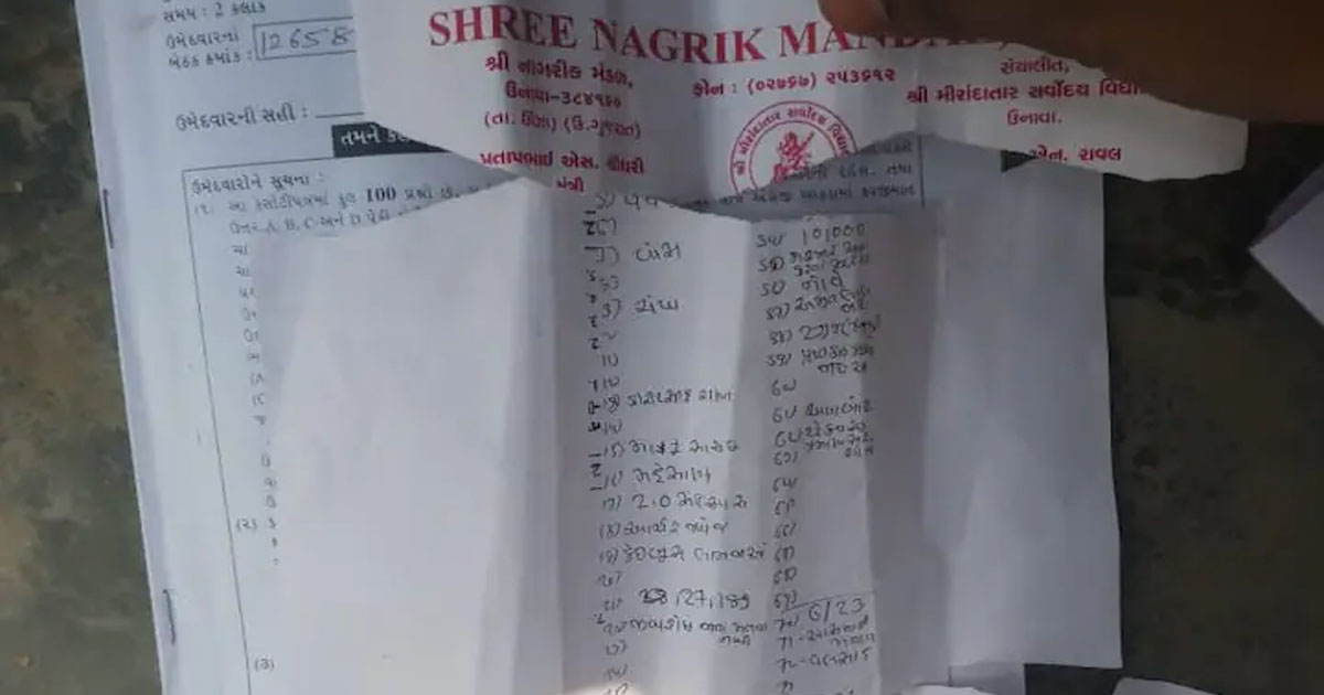 મહેસાણાની ઉનાવાની મીરા દાતાર સર્વોદય વિદ્યાલયમાંથી પેપર ફૂટ્યું હોવાનો આક્ષેપ કરવામાં આવી રહ્યો છે. પરીક્ષા દરમિયાન નાગરિક મંડળ ના લેટર પેડ ઉપર પરીક્ષામાં પૂછયેલા સવાલોના જવાબ લખેલાના ફોટો સોશિયલ મીડિયા પર ફરતા થયા છે. 10 નંબરના બ્લોકમાંથી પાણી પીવા બહાર આવેલો વિધાર્થી જવાબ વાળા લેટરપેડ સાથે રૂમમાં આવ્યો હતો. પરીક્ષા ખંડમાં જવાબ સાથે ઉમેદવાર આવતાં નિરીક્ષકે પકડી પાડ્યો હતો અને પેપર ફોડવાનો ભાંડો ફૂટ્યો હતો.ત્યારે અહી સવાલ એ થાય છે શું કોઈને આ પેપર પહેલીથી મળી ગયું હશે?